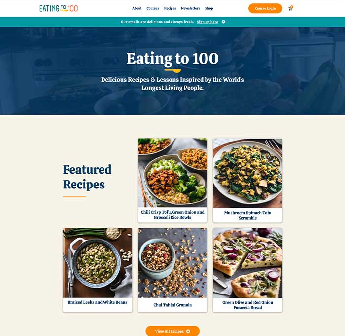 For Eating to 100, I created the full brand identity from scratch—including logo design, color palette, and visual system—before carrying it through to a modern, approachable website. The platform spotlights Dan Buettner’s research and recipes while making content easy to explore and apply. The result is a fresh, cohesive brand and digital experience that educates, inspires, and connects people with the principles of longevity.